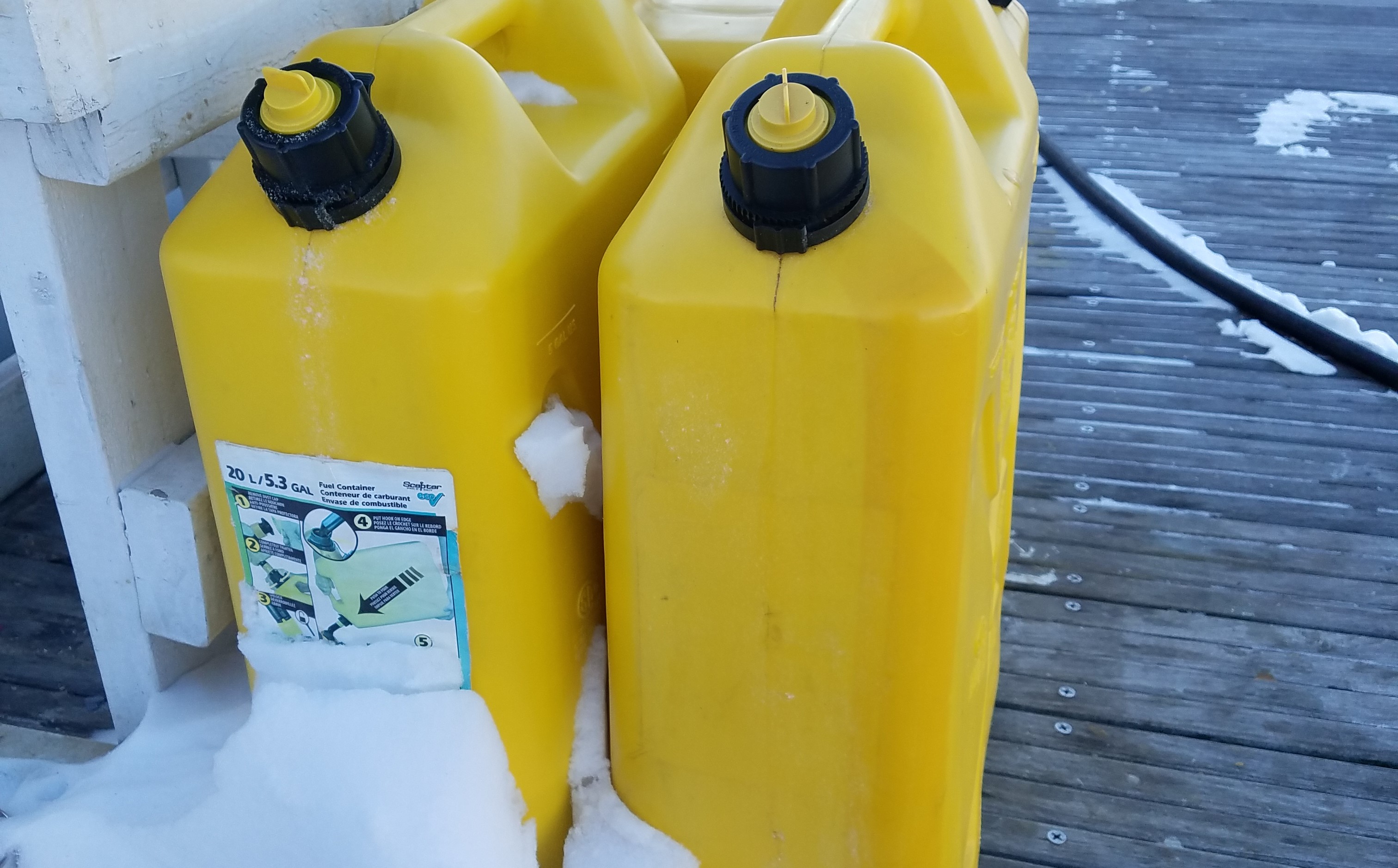 Those 10 gallons were stored in jerry cans on the docks and so the diesel’s temperature was about 15 degrees F (-9.5 degrees C.) The fuel already in the tank was about 55 degrees F (13 degrees C.)